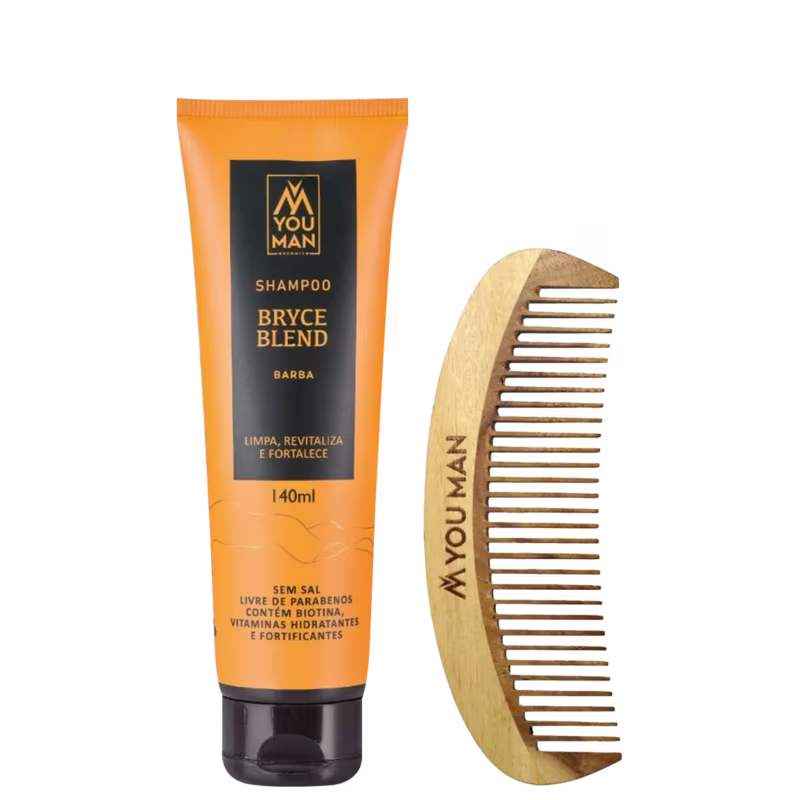 O Kit You Man Grooming Bryce Blend Fortificante + Pente conta com um shampoo fortificante que deixa os fios limpos, saudáveis, hidratados e com brilho renovado, além de auxiliar no controle da oleosidade, deixando um toque sedoso. Também acompanha um pente de madeira curvo, que faz com que os fios não arrebentem e ainda ajuda no controle do frizz uma vez que a madeira age como neutralizador da estática dos fios.