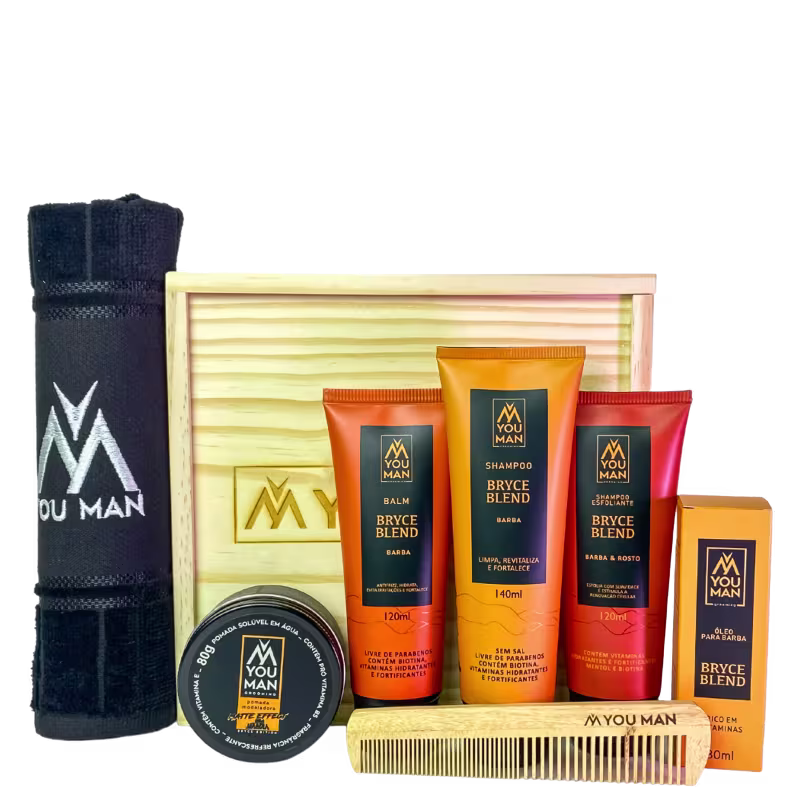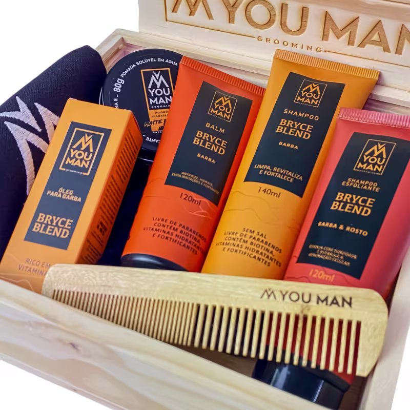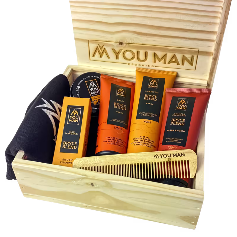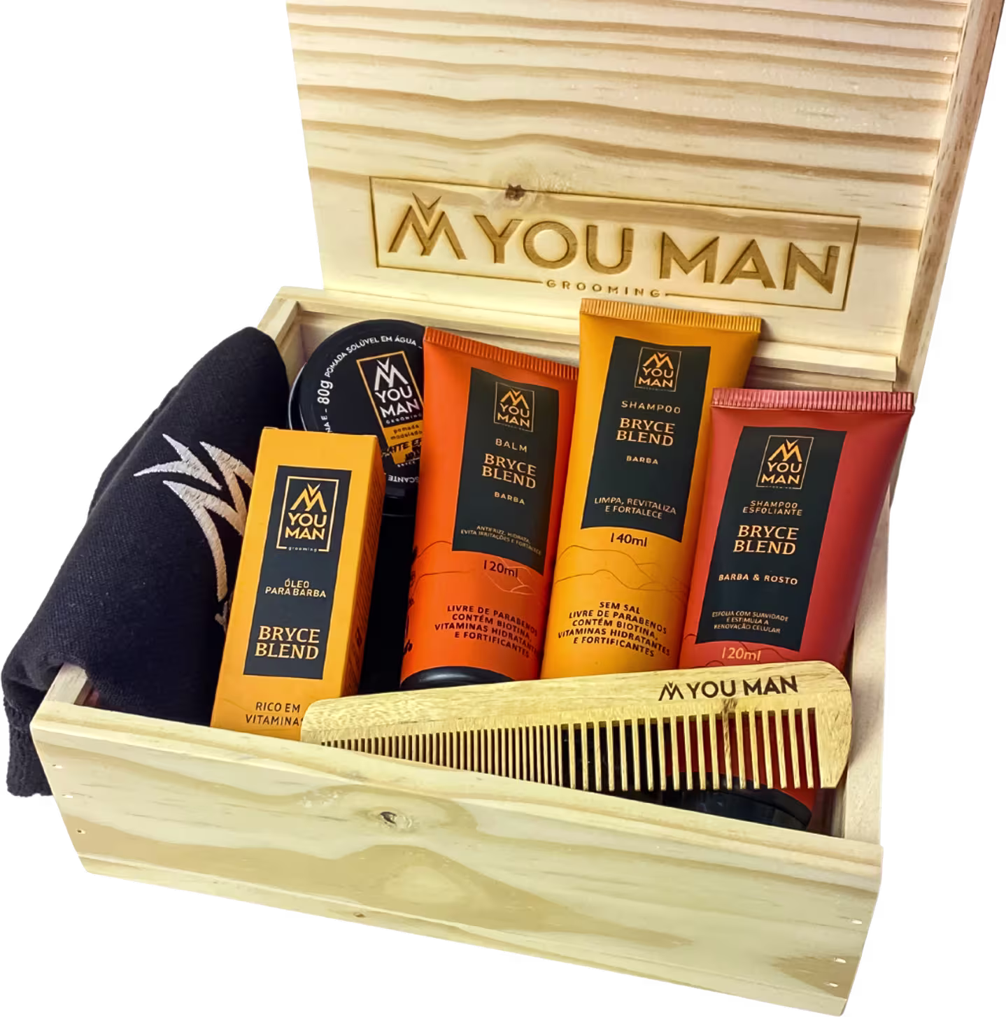 O Kit You Man Grooming Completo é super completo e proporciona ao homem os cuidados que ele merece com a sua barba e também com os cabelos, em casa, de maneira prática, eficiente, moderna e claro, cheia de estilo. Os itens do kit vão dentro de uma caixa de madeira exclusiva.