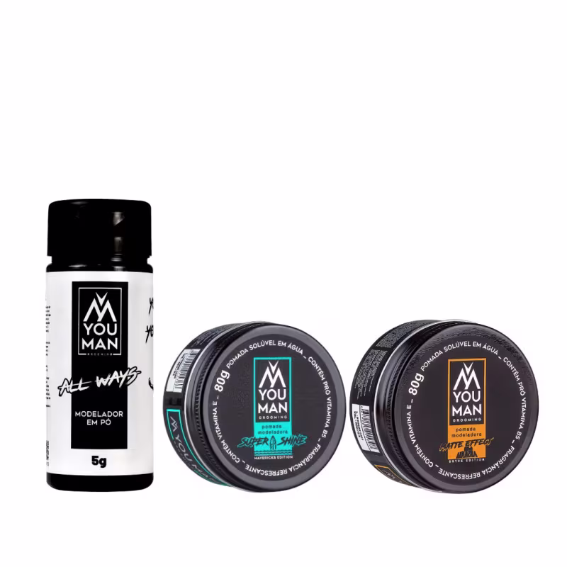 Kit com pomada modeladora e modelador em pó. You Man Grooming Modeladores Capilares promove penteados firmes e com efeito molhado e matte, garantindo volume e textura aos fios masculinos.
