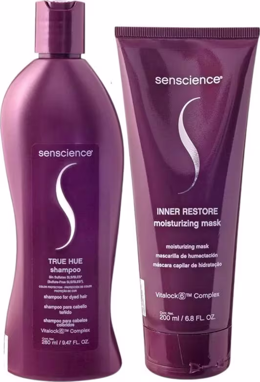 Kit para cabelos coloridos. Senscience True Hue Treatment oferece reparação, proteção e brilho, garante uma preservação intensa da coloração, além de melhorar a flexibilidade e a elasticidade dos fios, evitando a quebra. Sua fórmula enriquecida evita a oxidação ou o desbotamento da cor.