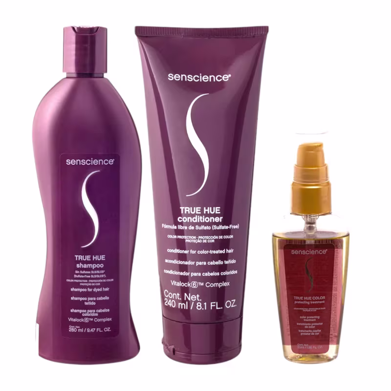 Senscience True Hue Color Protecting Treatment 55ml (Sérum Capilar): Um sérum finalizador que ajuda a fixar a coloração, prevenindo o desbotamento. Além disso, protege contra os raios solares, repara a estrutura interna dos fios, fortalece e melhora a flexibilidade, evitando quebras. Proporciona um brilho intenso sem pesar.
