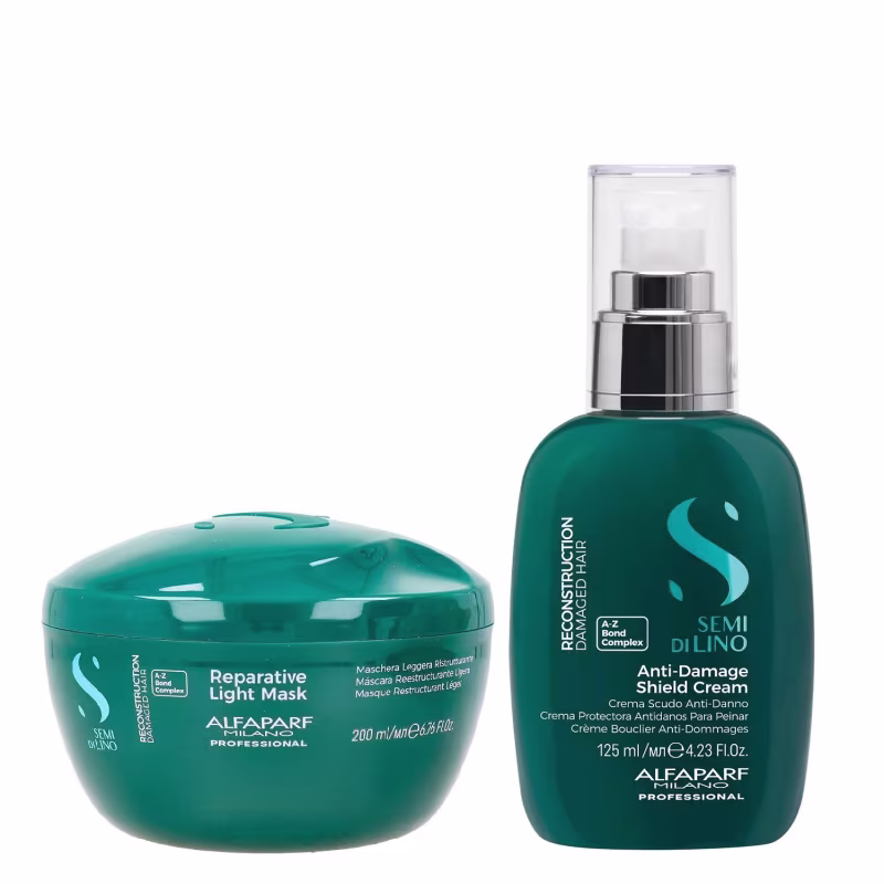 Renasça seus cabelos danificados e fragilizados com o Kit Alfaparf Semi Di Lino Reconstruction, que combina a Máscara Reconstrutora Suave 200ml e o Creme para Pentear Protetor Antidanos 125ml. Este duo poderoso oferece um tratamento que restaura a estrutura dos fios, preenchendo as áreas mais afetadas e devolvendo a força, a elasticidade e um brilho espetacular, tudo isso com uma textura leve que não pesa. É ideal para cabelos que foram agredidos por processos químicos ou mecânicos, ou que apresentam quebra e ressecamento, proporcionando um cuidado contínuo e eficaz.