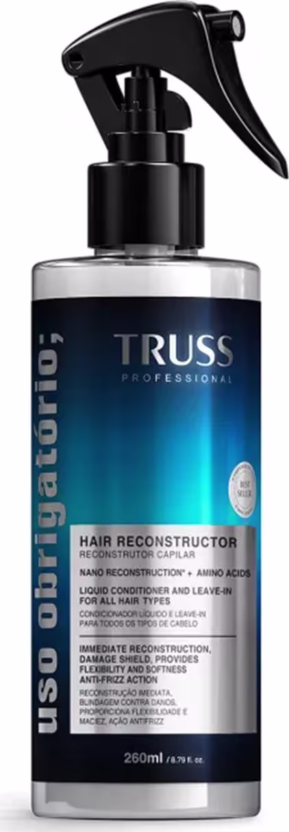 Truss Uso Obrigatório Reconstrutor Capilar 260ml: Um tratamento versátil e poderoso que reconstrói a fibra capilar, fortalece, protege contra o calor de ferramentas térmicas e outros danos, além de proporcionar brilho intenso e reduzir o frizz. É um aliado indispensável para cabelos que precisam de reparação e proteção extra.