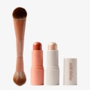 O kit contem: 1 Mascavo Pro Series 01 Pincel de Maquiagem Duplo para Rosto 1 Mascavo Glow Stick Iluminador em Bastão Champagne - 6g 1 Mascavo Flush Stick Blush em Bastão Maple - 6g