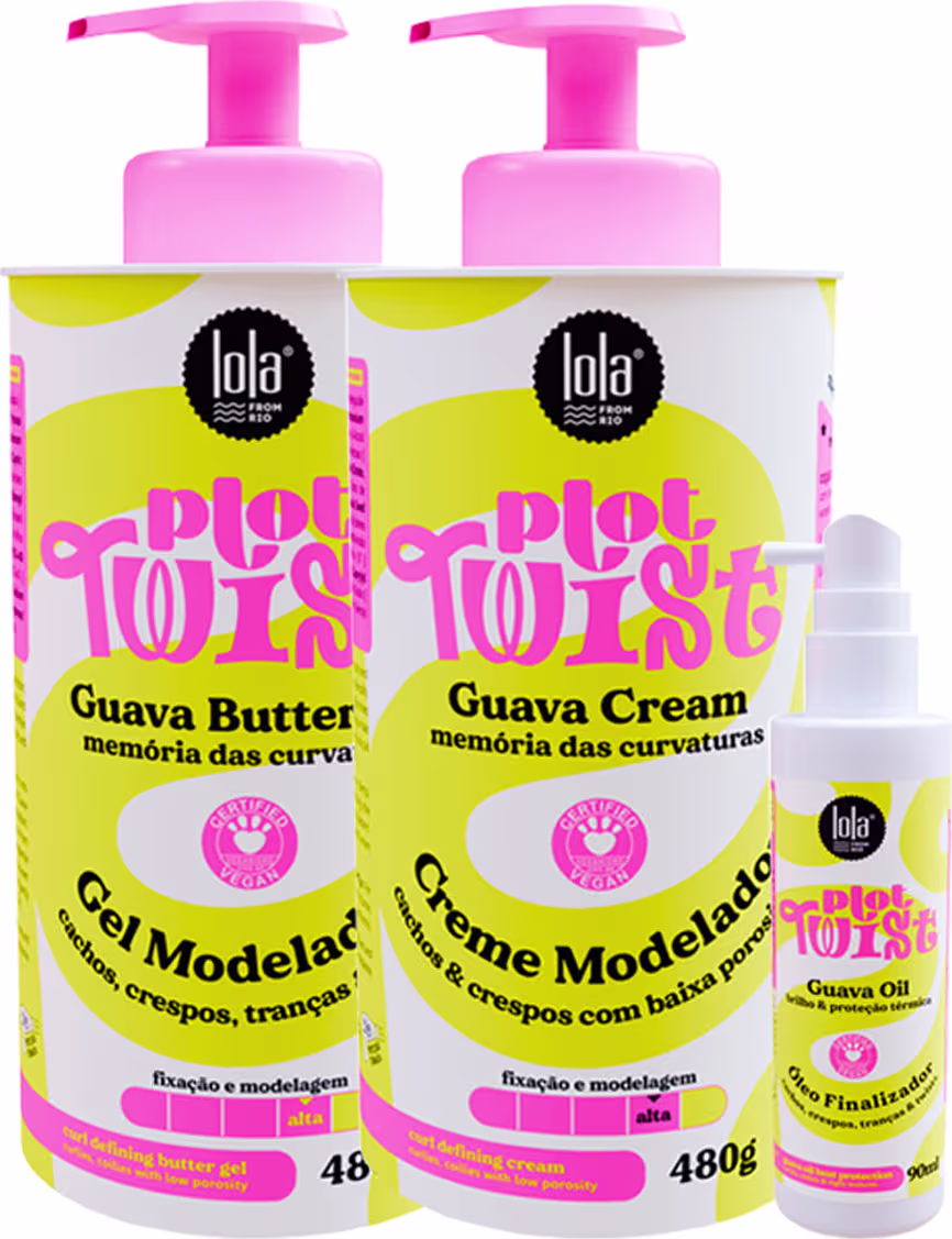 Kit Lola Cosmetics Plot Twist para cabelos crespos e cacheados com porosidade baixa. * RESULTADO: Hidratação * SUGESTÕES DE USO: Óleo: 1. Divida o cabelo, úmido ou seco. 2.Borrife uniformemente a uma distância de 10-15 cm em cada seção antes de usar ferramentas de calor, como modelador de cachos ou secador de cabelo. Gel: 1.Com os cabelos limpos, condicionados e ainda úmidos, divida-o em seções. 2.Começando da nuca, distribua uma quantidade do tamanho de uma moeda de Guava Butter Gel em cada seção. 3.Ap„s a aplicação, para dar um reforço extra na definição, faça o movimento clássico de movimentar as pontas dos cabelos de baixo para cima. 4.Para garantir um resultado mais incrível, quando o cabelo estiver totalmente seco, aplique um pouco de Guava Bio Oil nas mãos e amasse novamente para quebrar o aspecto crocante dos fios. Manteiga Modeladora: 1.Nos cabelos higienizados, condicionados e bem úmidos, distribua Nut ButterCream uniformemente mecha a mecha enquanto define o estilo desejado. 2.Faça filtragem para estimular o desenho dos cachos. 3.N†o enxague. 4.Estilize como de costume. 5.Solte a raiz com pente garfo quando estiver * ITENS INCLUSOS: 1 Óleo Capilar Lola Cosmetics Plot Twist 90 Ml; 1 Gel Modelador Lola Cosmetics Plot Twist 480 G; 1 Creme Modelador Lola Cosmetics Plot Twist 480g