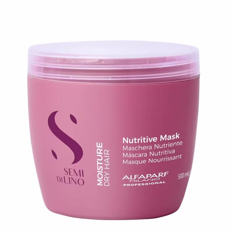 Máscara de Hidratação Intensa Alfaparf Semi Di Lino Moisture (500ml): O tratamento intensivo do kit, com sua embalagem de 500ml, age repondo a umidade e os nutrientes essenciais que os cabelos secos necessitam. Sua fórmula, enriquecida com Nutri-Sugars, retém a água na fibra capilar, deixando os fios macios, sedosos e com a elasticidade restaurada.