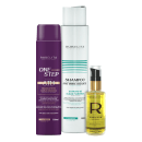 Rubelita Professional Kit Realinhamento One Step Blond 300ml + Shampoo Antirresíduo + Resistent Oil 60ml oferece um protocolo profissional completo para alinhar, tratar e selar fios loiros, entregando efeito liso natural, controle de volume e brilho radiante.