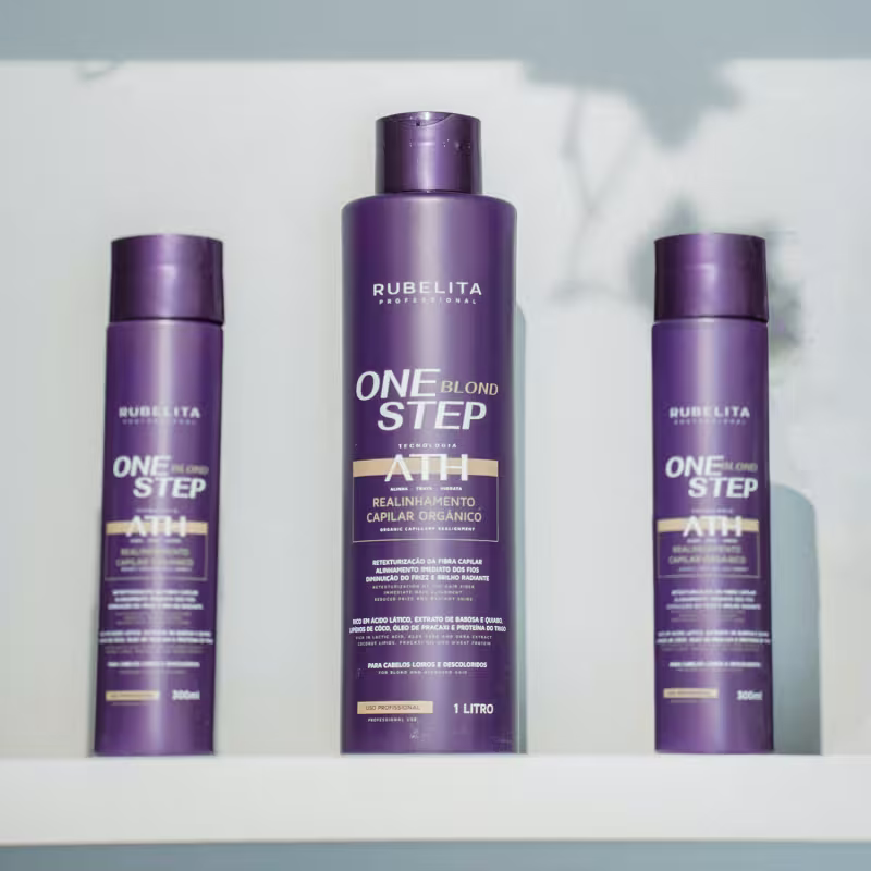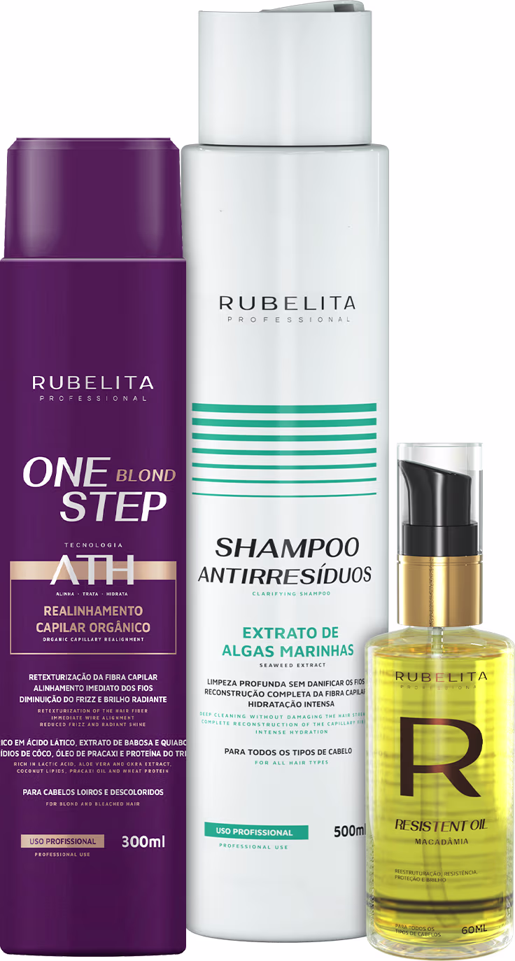 One Step Blond Rubelita Professional é uma formulação de realinhamento orgânico desenvolvida para loiros: sua Tecnologia ATH (Alinha, Trata e Hidrata) atua com ativos como Lipídios de Coco, Proteína do Trigo, Óleo de Pracaxi, Extrato de Quiabo, Extrato de Babosa e Ácido Lático para reparar, nutrir e selar cutículas sem agredir a cor. O Shampoo Antirresíduo Algas Marinhas prepara a fibra com limpeza profunda e remoção de resíduos, permitindo melhor penetração dos ativos; já o Resistent Oil (Óleo de Macadâmia) finaliza o trabalho, nutrindo intensamente as pontas, reduzindo o frizz e conferindo brilho e maciez ao toque. Juntos, os produtos garantem realinhamento progressivo, desembaraço facilitado e acabamento profissional.