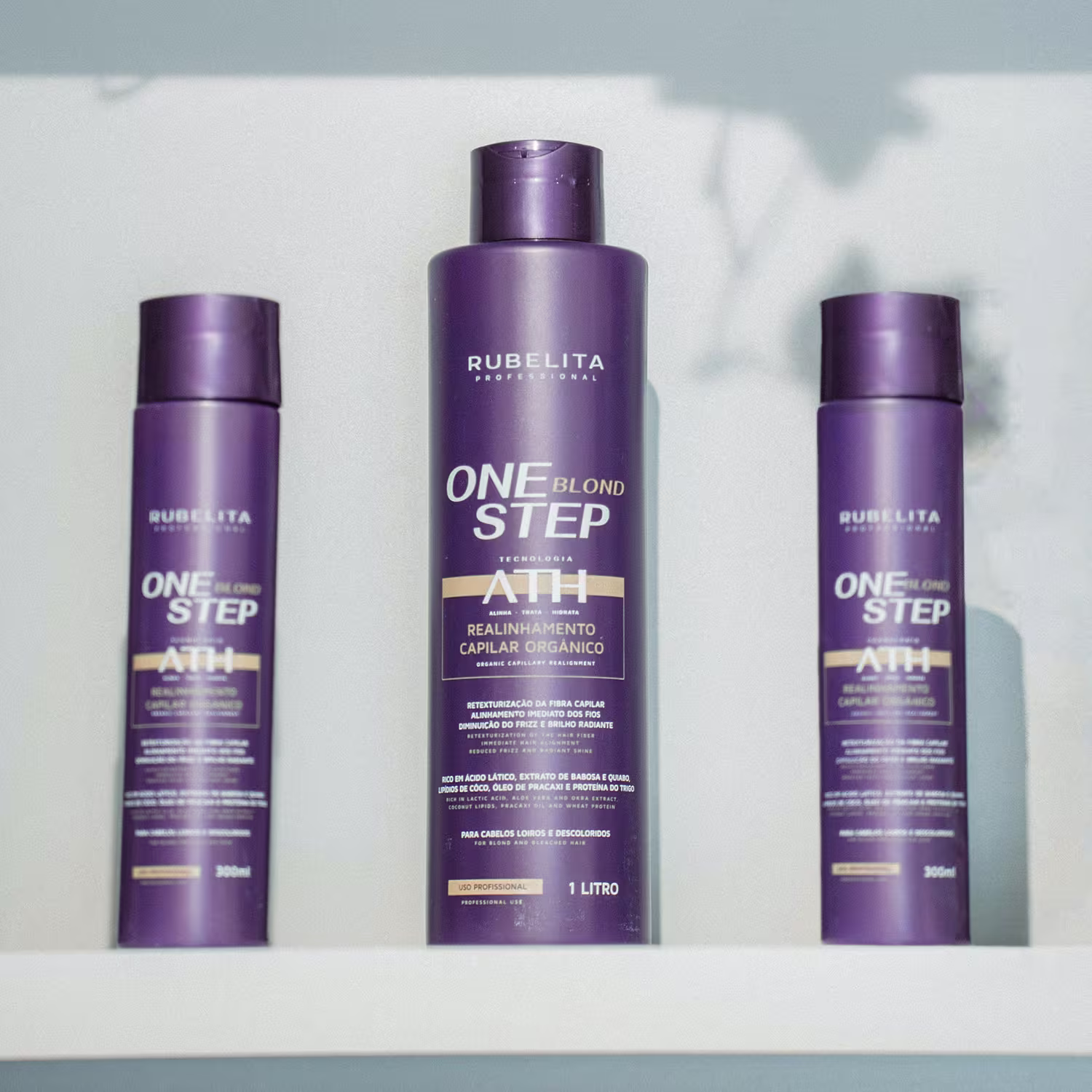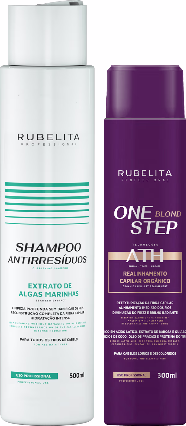 Shampoo Antirresíduo Rubelita Professional é formulado com Extrato de Algas Marinhas para limpeza profunda e remoção de resíduos que impedem a ação dos tratamentos; prepara o cabelo para receber a etapa de realinhamento. One Step Blond Rubelita Professional (Realinhamento Orgânico) traz a Tecnologia ATH (Alinha, Trata e Hidrata) em uma fórmula 100% orgânica e sem formol, enriquecida com Ácido Lático, Aloe Vera, Extrato de Quiabo, Lipídios de Coco, Óleo de Pracaxi e Proteína do Trigo. Essa combinação promove realinhamento progressivo, nutrição intensa, controle de volume e frizz, além de preservar a luminosidade dos tons loiros quando aplicada corretamente por profissional.
