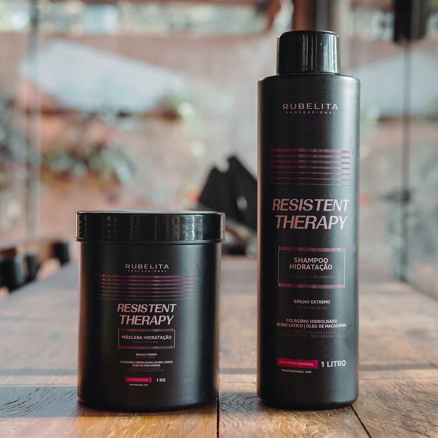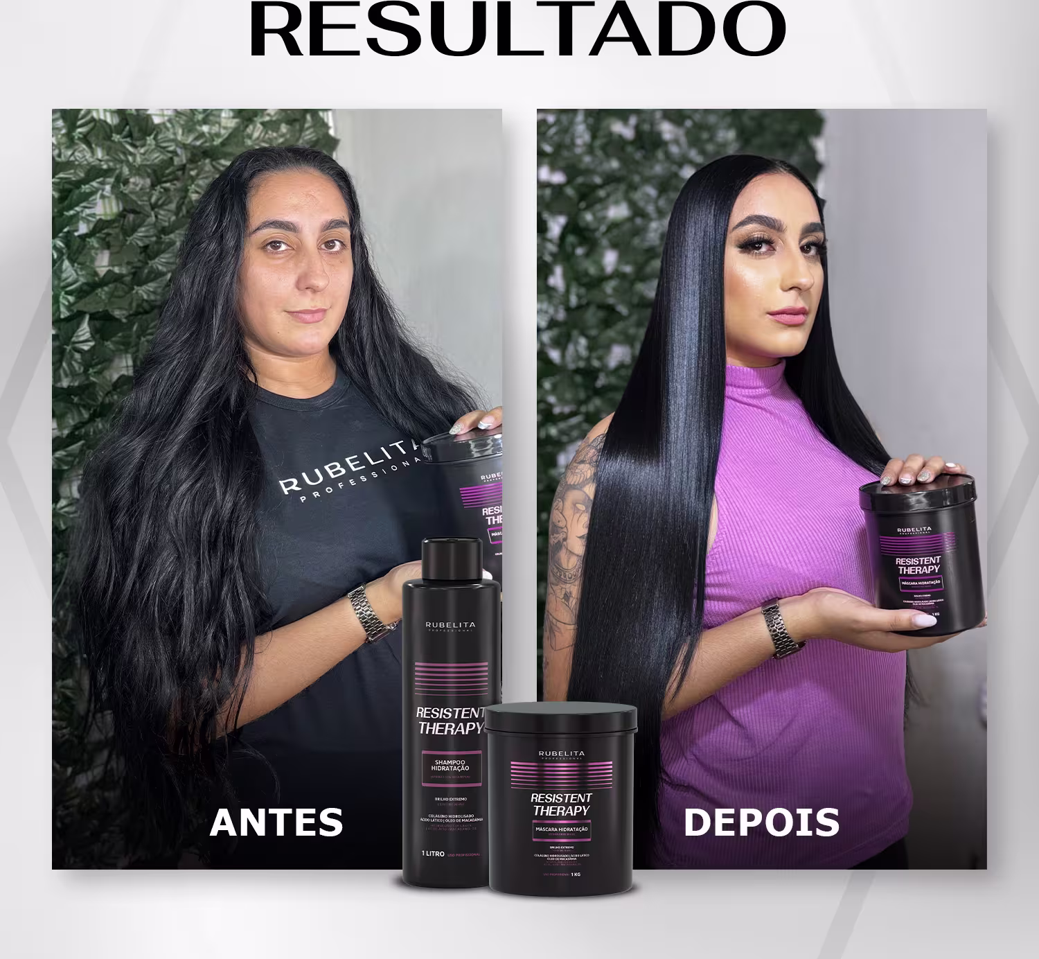 Rubelita Professional – Shampoo Resistent Therapy Hidratação Capilar 1L: limpa suavemente enquanto inicia o processo de hidratação, preparando os fios para receber o tratamento intensivo.