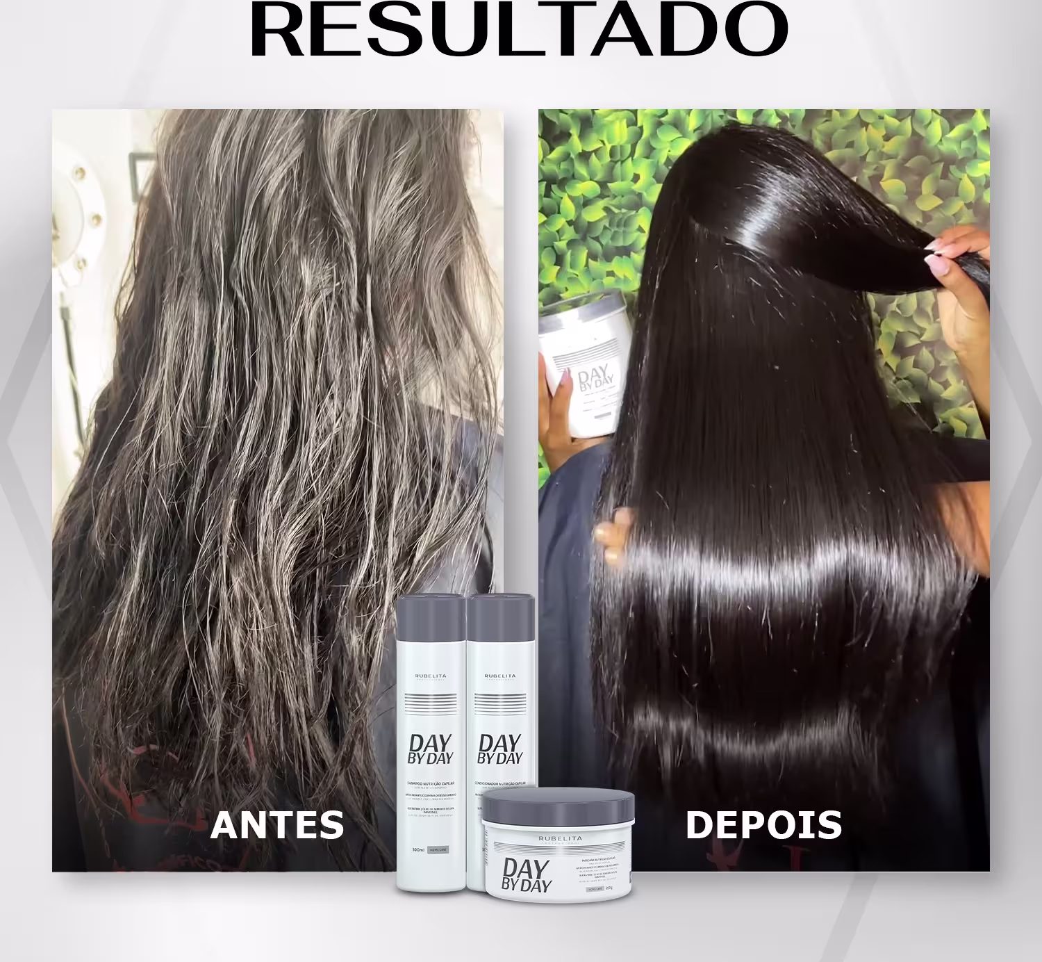 O Kit Day By Day Nutrição Capilar Rubelita Professional combina Queratina Hidrolisada, Pantenol e Óleo de Semente de Uva. Essa sinergia de ingredientes poderosos promove reconstrução da fibra capilar, hidratação profunda e reposição de nutrientes essenciais. O resultado são fios mais resistentes, macios, sedosos e com um brilho radiante.