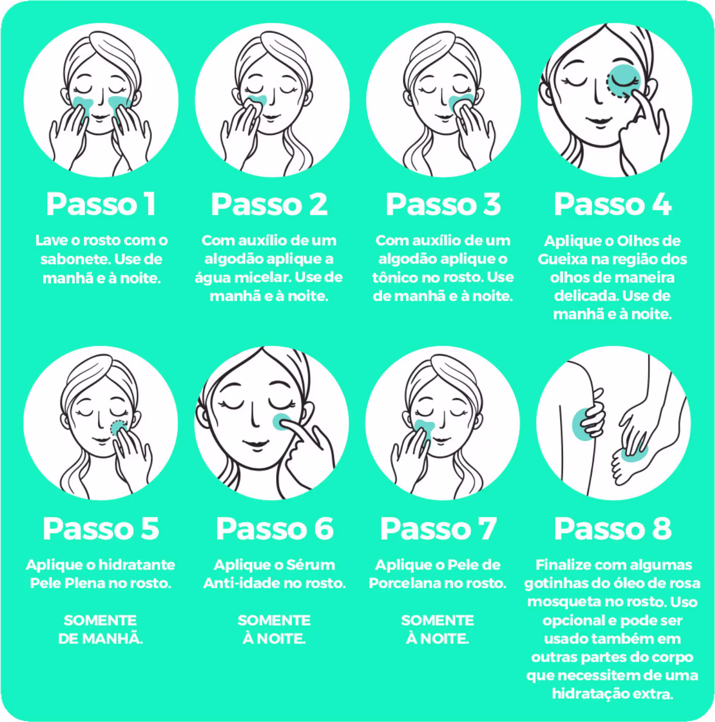 Lave o rosto com o Sabonete Líquido Facial Pele de Porcelana, com o auxílio de um algodão aplique a Água Micelar de Arroz, com o auxílio de um novo algodão aplique o Tônico Facial Pele de Porcelana, aplique o Olhos de Gueixa na região dos olhos, aplique o Creme Gel Pele Plena, aplique o Sérum Anti-Idade, e por último aplique o Pele de Porcelana junto com algumas gotinhas do Óleo de Rosa Mosqueta (faça uma misturinha nas mãos). O Óleo de Rosa Mosqueta é opcional e pode ser usado também em outras partes do corpo que necessitem de uma hidratação extra.