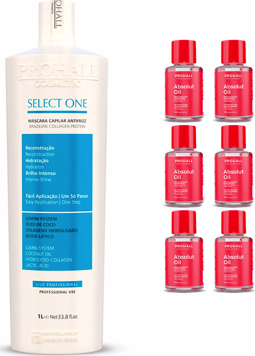 O Kit Prohall Cosmetic Select One Antifrizz + Absolut Oil Big conta com a poderosa máscara progressiva, que combina a fusão de ativos como Lumini System, Ácido Lático, Óleo de Coco e Colágeno Hidrolisado para realinhar, reconstruir e reparar danos. Sua fórmula exclusiva penetra profundamente na fibra capilar, eliminando o volume excessivo e o frizz, enquanto nutre, hidrata e confere um brilho intenso aos fios. Além disso, a opção vem acompanhada do incrível reparador de pontas Absolut Oil, responsável por disciplinar os fios e proporcionar maciez e brilho.
