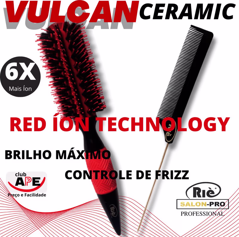 COMPOSTO POR: 01 Escova VULCAN CERAMIC RED ÍON TECHNOLOGY 57 mm MARCA: RIÈ salon-pro DIÂMETRO: 57 MM CERDAS: 100% Javali BASE: Cerâmica + Red Íon, selam as cutículas dos fios, dando maciez e brilho extremo. Antifrizz e Anti Static: cuidado máximo e fios super alinhados; CABO: Ergonômico - Madeira Revestido - Durabilidade e leveza da Madeira e Mais Conforto para suas mãos A Escova Vulcan Ceramic Red Ion Technology ajuda a selar os fios e a reduzir o frizz enquanto alisa ou modela o cabelo. A Escova Vulcan Ceramic Red Ion Technology apresenta tecnologia RED ÍON que libera íons que selam as cutículas dos fios com óleos naturais, dando assim maciez e brilho extremo ao cabelo; e o revestimento de cerâmica ajuda a reduzir o frizz e quebras. Ideal para uma secagem com brilho máximo e fios disciplinados para uma escova perfeita.