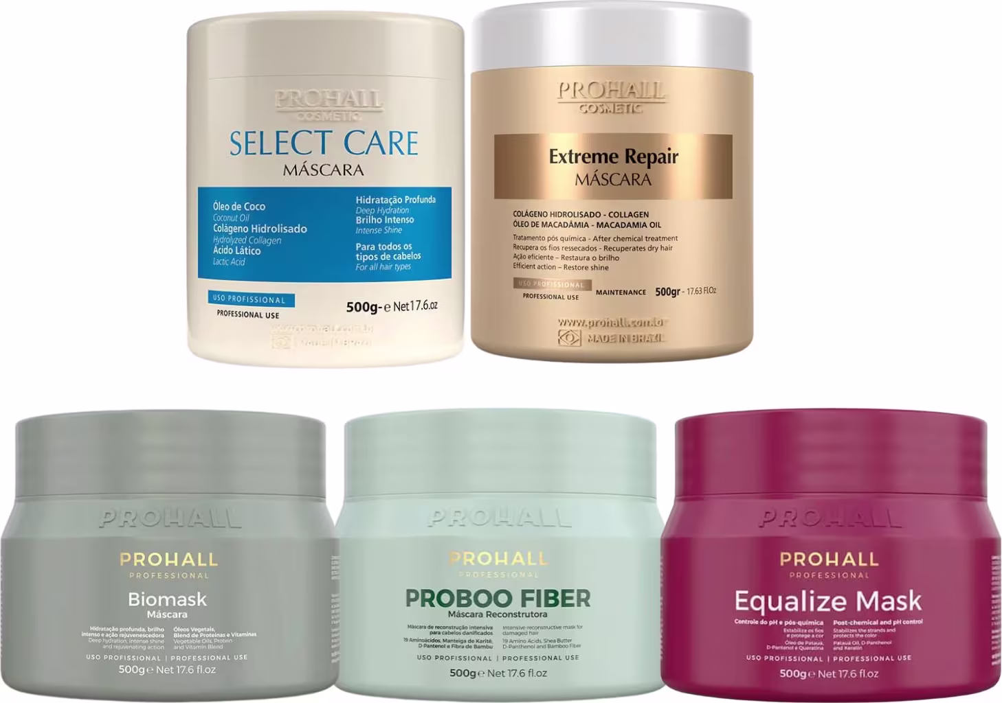 Kit 5 Máscaras 500g – Biomask, Extreme Repair, Proboo Fiber, Equalize e Select Care