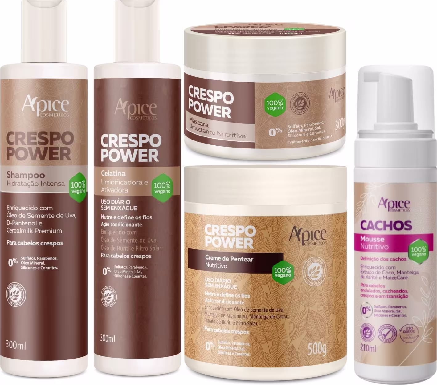 Kit Apice Crespo Power Shampoo + Gelatina + Mascara + Creme de Pentear + Mousse Cachos Profissional