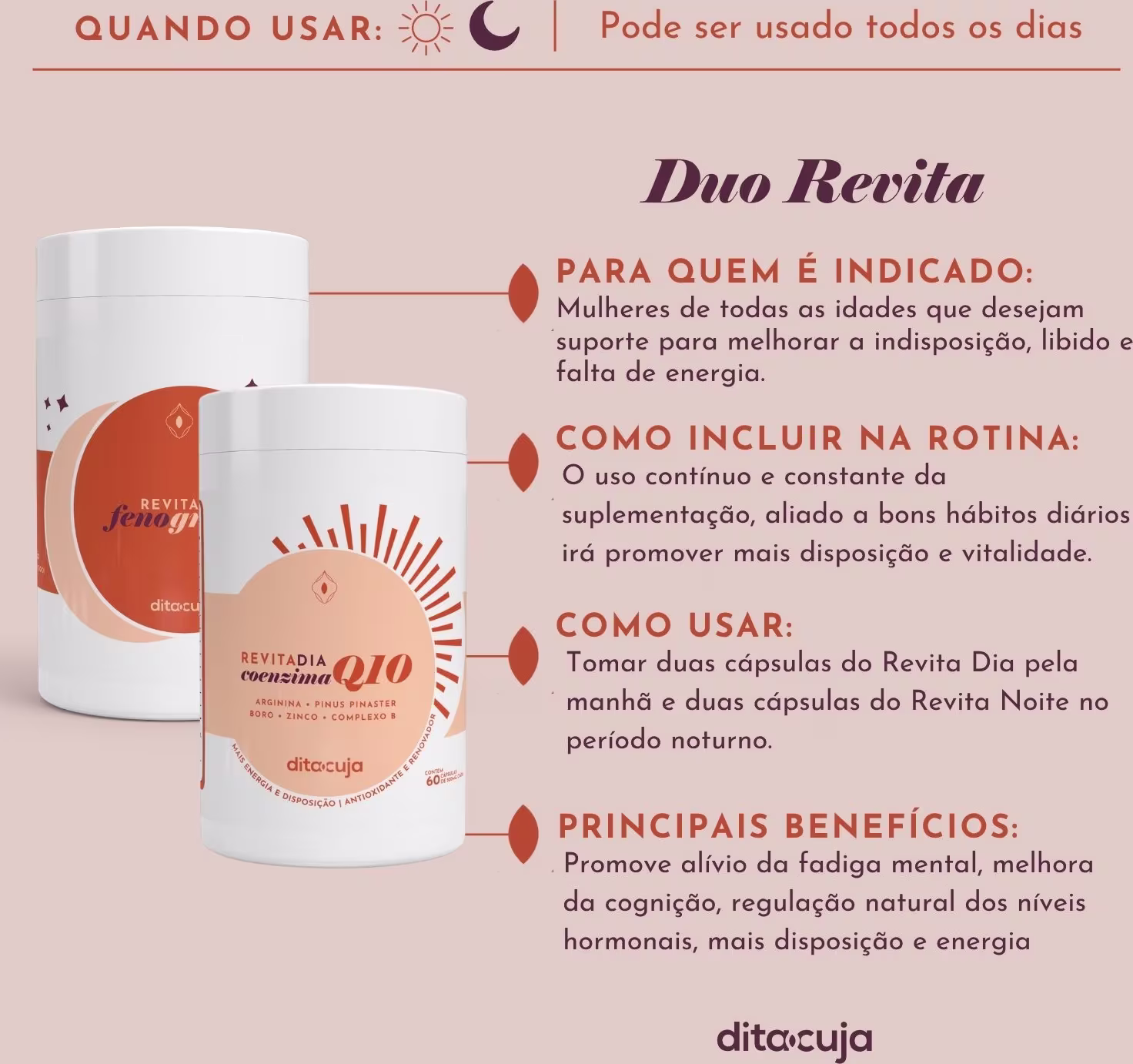 Nascida no Brasil, a Dita Cuja promove um novo jeito de pensar na vida e no autocuidado íntimo ao oferecer dermocosméticos e suplementos íntimos com componentes seguros para o organismo e o planeta. Indicada por ginecologistas e dermatologistas, a marca promove soluções para problemas cotidianos entre as mulheres, que não são falados abertamente, pelo fato dos temas ainda serem considerados tabus. O autocuidado íntimo pode sim ser leve, descontraído, simples e seguro. Dessa forma, mulheres não precisam mais sofrer caladas, pois tem ao seu alcance soluções para lidar com irritações, foliculite, ressecamentos, infecções, manchas, incômodos e envelhecimento íntimo. Diariamente, as mulheres são cobradas por cuidados com a saúde física e mental, se preocupam em ter uma alimentação equilibrada, praticar exercícios e controlar o stress, não é mesmo? Entretanto, manter a saúde como um todo é ainda mais amplo do que isso e envolve outras questões primordiais, como a nossa intimidade. Cuidados íntimos básicos, ainda costumam ser deixados de lado, por parecerem futilidade ou gerar constrangimentos, no entanto, estão profundamente vinculados ao bem-estar integral. Sua intimidade é seu templo sagrado. Pensando nisso, a Dita Cuja tem o propósito de reduzir os incômodos enfrentados pelas mulheres, ao inovar e otimizar a rotina de cuidados intimos com produtos de qualidade. Cuidar da Dita Cuja, é cuidar do corpo todo!