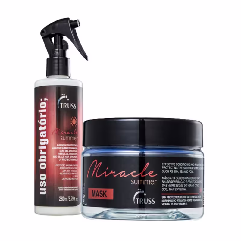 O Kit TRUSS Miracle Summer Protect Duo foi formulada especificamente para quem ama o verão e quer ter cabelos saudáveis durante o ano todo. Com ingredientes como Vitamina E, Aminoácidos e Extrato de Algas, dá resultado imediato de reestruturação e regeneração da fibra capilar, com tratamento preventivo e curativo.