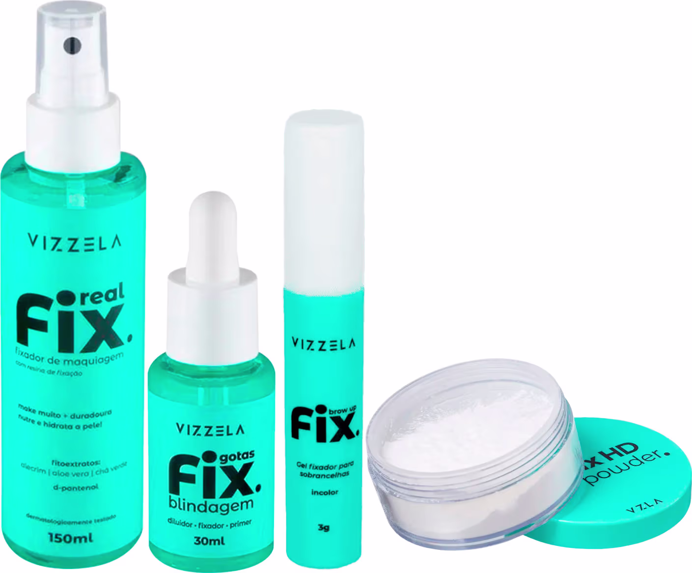 Vizzela Real Fix 150ml + Gotas Fix 30ml + Brow Up Fix 3g + Pó Fix HD 15g (4 Produtos)Vizzela Real Fix Fixador de Maquiagem 150mlO Real FIX é um fixador de maquiagem formulado com alta concentração de resina que aumenta a durabilidade da make e fitoextratos de alecrim, aloe vera e chá verde que possuem efeito antioxidante e revitalizante, combinado com o D-pantenol que nutre e hidrata a pele.Características:- Fixação duradoura- Com resina de fixação e d-pantenol- Fitoextratos de alecrim, aloe vera e chá verde- Nutre e hidrata a pele- Vegano- Dermatologicamante testado- Cruelty freeComo Usar:aplique com os olhos fechados 30cm da face e esperar secar.#Dica de amiga: o real fix pode ser utilizado para umedecer sombras e iluminadores para aumentar a resistencia e intensificar a cor.Contém: 150 mlVizzela Gotas Fix Blindagem Fixador de Maquiagem 30mlO Gotas FIX Blindagem é um fluido multifuncional profissional que pode ser utilizado para diluir maquiagens, recuperar maquiagens ressecadas, aumentar a durabilidade e resistência da maquiagem e deixar à prova d’água. Livre de óleo e formulado com alta concentração de resina fixadora.características:- Diluidor- Fixador- Primer- Ideal para técnica pele blindada- Vegano- Dermatologicamante testado- Cruelty freeComo Usar:Você pode aplicar diretamente sobre a pele como um primer antes de realizar a maquiagem e em produtos você pode misturá-lo com algumas gotas até obter a textura desejada.#Dica de amiga: O Gotas Fix pode ser utilizado em vários produtos, como: Bases, corretivos e produtos cremosos.Contém: 30mlVizzela Gel Fixador Incolor Brow Up Fix 3g (Alta Fixação e Definição)O Gel fixador para sobrancelhas BROW UP FIX é um gel efeito cola de alta fixação, que mantém os pelinhos das sobrancelhas no lugar por longa duração.Seu pincel mini proporciona uma aplicação detalhada e precisa, com formulação transparente sem precisar se preocupar com o tom das sobrancelhas. Com o BROW UP FIX Gel fixador é possível fixar as sobrancelhas do jeito que preferir, penteando no sentido natural do crescimento dos fios ou fazer o efeito Brow Lamination, aquele em que você penteia e fixa os fios da sobrancelha para cima, dando um aspecto mais descolado ao look. Características: - Gel cola fixador para sobrancelhas- Super fixação- Fácil aplicação- Efeito Brow lamination- Pincel preciso- Dermatologicamente testado- Vegano e Cruelty free- Paraben free – livre de parabenosbora usar!?Remova os resíduos de bases ou outros produtos antes de utilizar. Aplique o produto com o auxílio do pincel, penteando as sobrancelhas do modo que desejar.#Dica de amiga: Penteie as sobrancelhas ao contrário e depois penteie do modo que desejar, assim o produto alcança todos os fios das sobrancelhas, fixando ainda mais.Vizzela Pó Fix HD Powder (Acabamento Matte e Textura Ultra Fina)Detalhes do produto:- Pó translucido hd- Acabamento matte- Ideal para finalizar a maquiagem- Fixador- Textura ultra fina- Resistente á águacaracterísticas:- Fórmula vegana – selo peta- Dermatologicamente testado- Cruelty free – não testado em animais- Paraben free – livre de parabenos- Pó fixador – acabamento matte- Ideal para finalizar a maquiagem- Textura ultra fina- Não estoura no flashbora usar: Aplicar sobre a face.#Dica de amiga: retire bem o excesso de pó após a aplicação para que o acabamento fique ainda mais bonito.contém: 9g