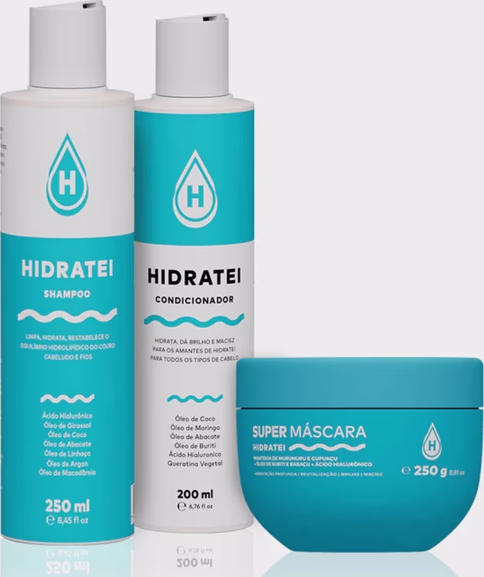 Descubra o poder de uma hidratação intensa e nutrição completa com o Kit Multifuncional Hidratei! Composto por Shampoo, Condicionador e a poderosa Super Máscara, este trio foi desenvolvido especialmente para mulheres que buscam cabelos macios, saudáveis e com brilho radiante.