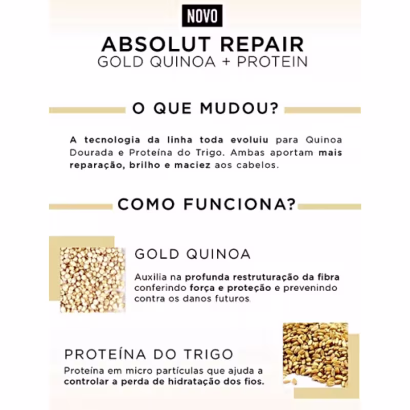 - L'Oréal Professionnel Serie Expert Absolut Repair Gold Quinoa + Protein - Condicionador 1500ml: desembaraça e reestrutura a superfície do fio para mais brilho e leveza.