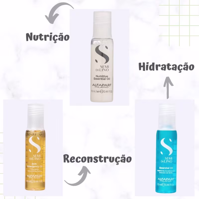 - Ampola Alfaparf Semi Di Lino Moisture Nutritive Essential Oil: reforça a fibra capilar e fornecendo nutrição ideal para mais suavidade, maciez e brilho por mais tempo.
