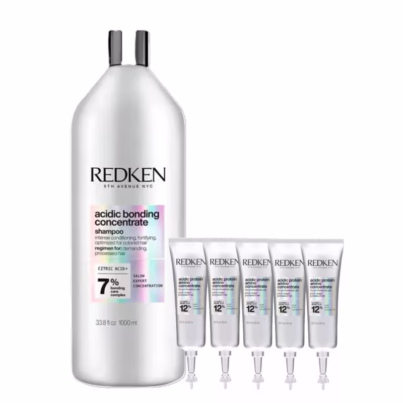 - Redken Acidic Bonding Concentrate - Shampoo 1L: proporciona uma limpeza equilibrada enquanto repara os danos. É o primeiro passo de um processo de 3 etapas do tratamento de reparação de danos;