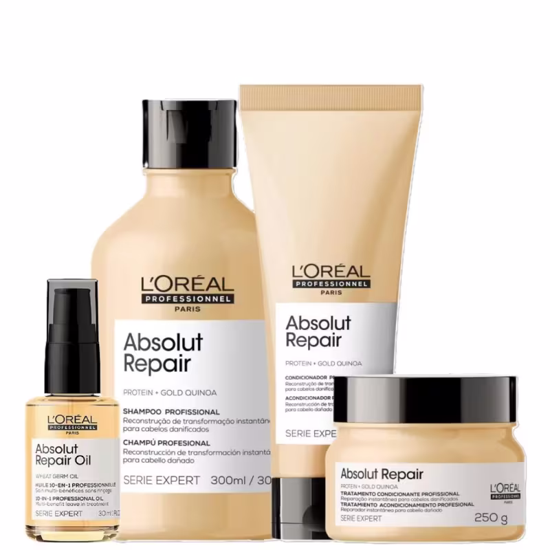 - L'Oréal Professionnel Serie Expert Absolut Repair Gold Quinoa + Protein - Máscara Capilar 250ml: uma restauração completa para devolver saúde e brilho;