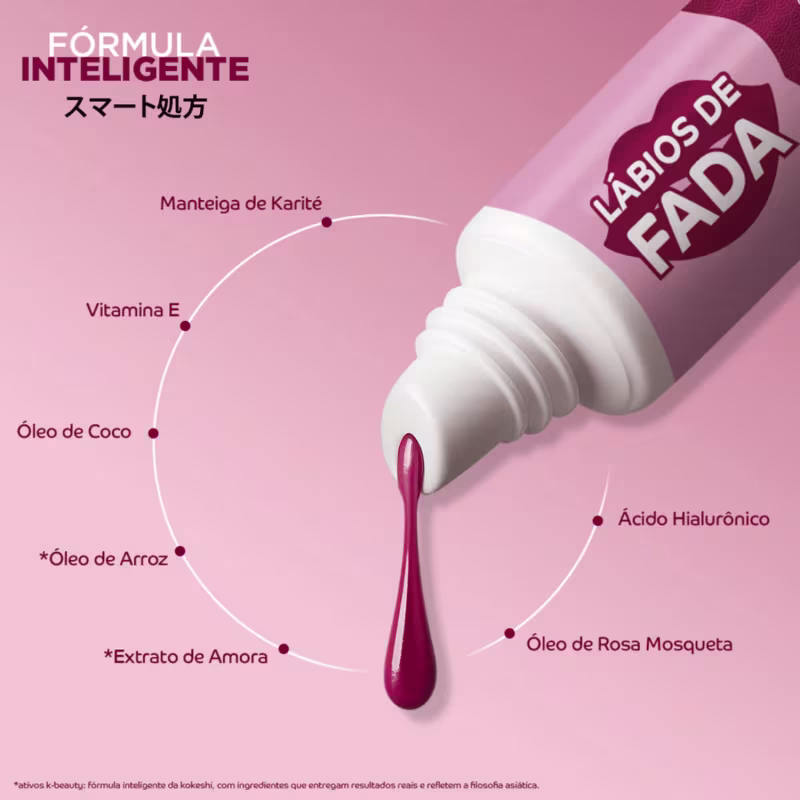 O Hidratante Lábios de Fada Kokeshi hidrata e nutre profundamente, deixando os lábios macios, com acabamento delicado e um sabor adocicado irresistível. Sua fórmula une manteiga de karité, vitamina E e óleos de arroz, coco e rosa mosqueta, em uma textura super confortável.
