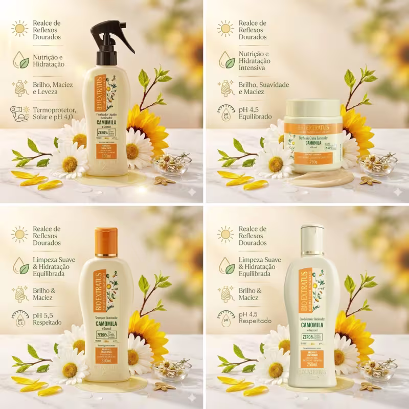 A linha Camomila da Bio Extratus foi desenvolvida especialmente para cabelos claros naturais ou descoloridos, ajudando a manter a luminosidade dos fios enquanto proporciona hidratação, maciez e leveza.