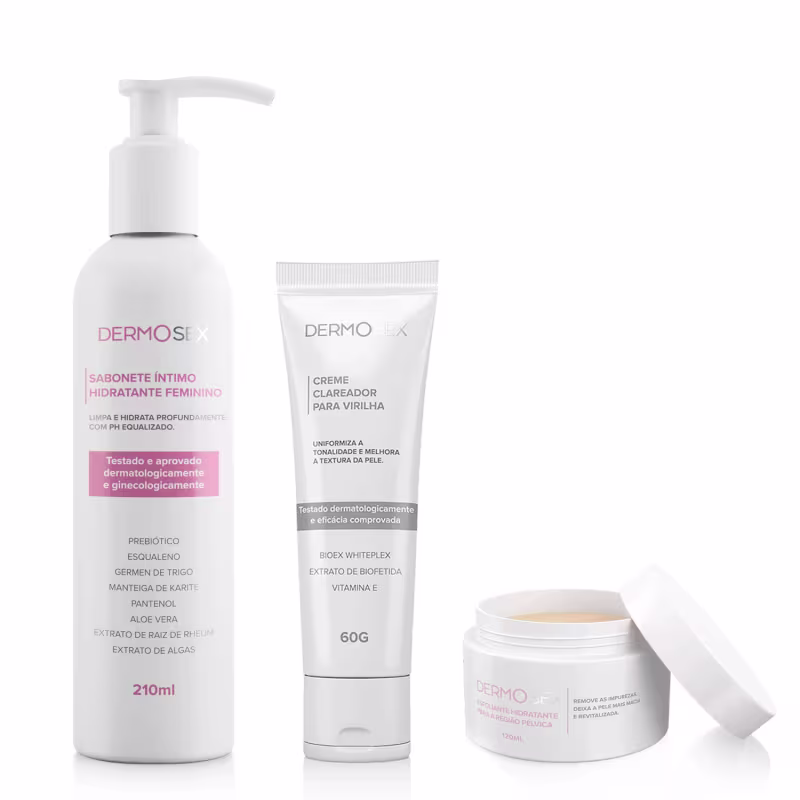 O Kit DermoSex é um sistema completo de tratamento pélvico desenvolvido com tecnologia dermocosmética. Sua formulação combina ativos sofisticados para proporcionar limpeza profunda, esfoliação nutritiva e clareamento eficaz, sendo ideal para o cuidado diário e semanal da região da virilha.