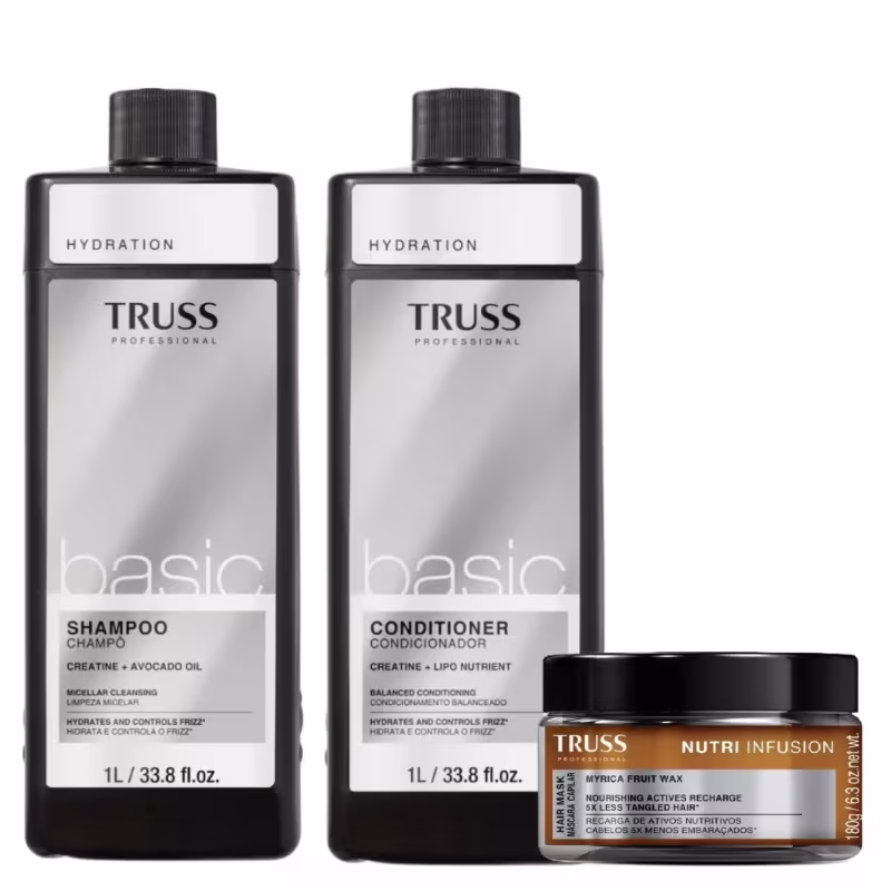 Kit Truss Basic Nutri Infusion (3 produtos); ideal para quem busca uma rotina completa de cuidado para os cabelos, com produtos de alta qualidade e que proporcionam uma experiência única. Contém o Shampoo Basic, que limpa profundamente e hidrata os fios, o Condicionador Basic, que condiciona, controla o frizz e promove a maciez, e máscara Nutri Infusion, que nutre, umidifica, minimiza os nós e revigora a estrutura dos fios.