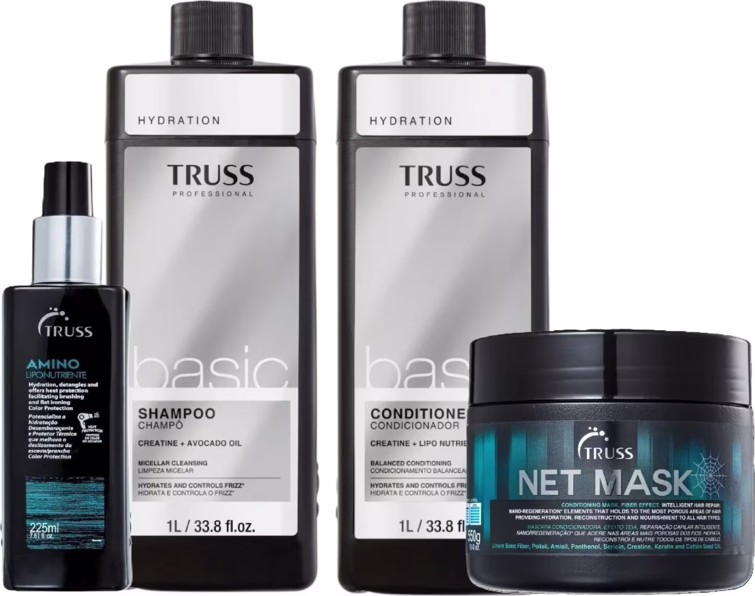 Kit Truss Basic Tratamento Liponutriente para Salão (4 produtos); ideal para quem busca uma rotina completa de cuidado para os cabelos, com produtos de alta qualidade e que proporcionam uma experiência única. Contém o Shampoo Basic, que limpa profundamente e hidrata os fios, o Condicionador Basic, que condiciona, controla o frizz e promove a maciez, a máscara NET Mask, que proporciona o melhor em tecnologia capilar e inovação cosmética que transforma a beleza de qualquer cabelo. Por último, o Spray Amino Liponutriente, que age como um tratamento protetor térmico instantâneo, hidratando, desembaraçando e melhorando o deslizamento da escova/prancha.