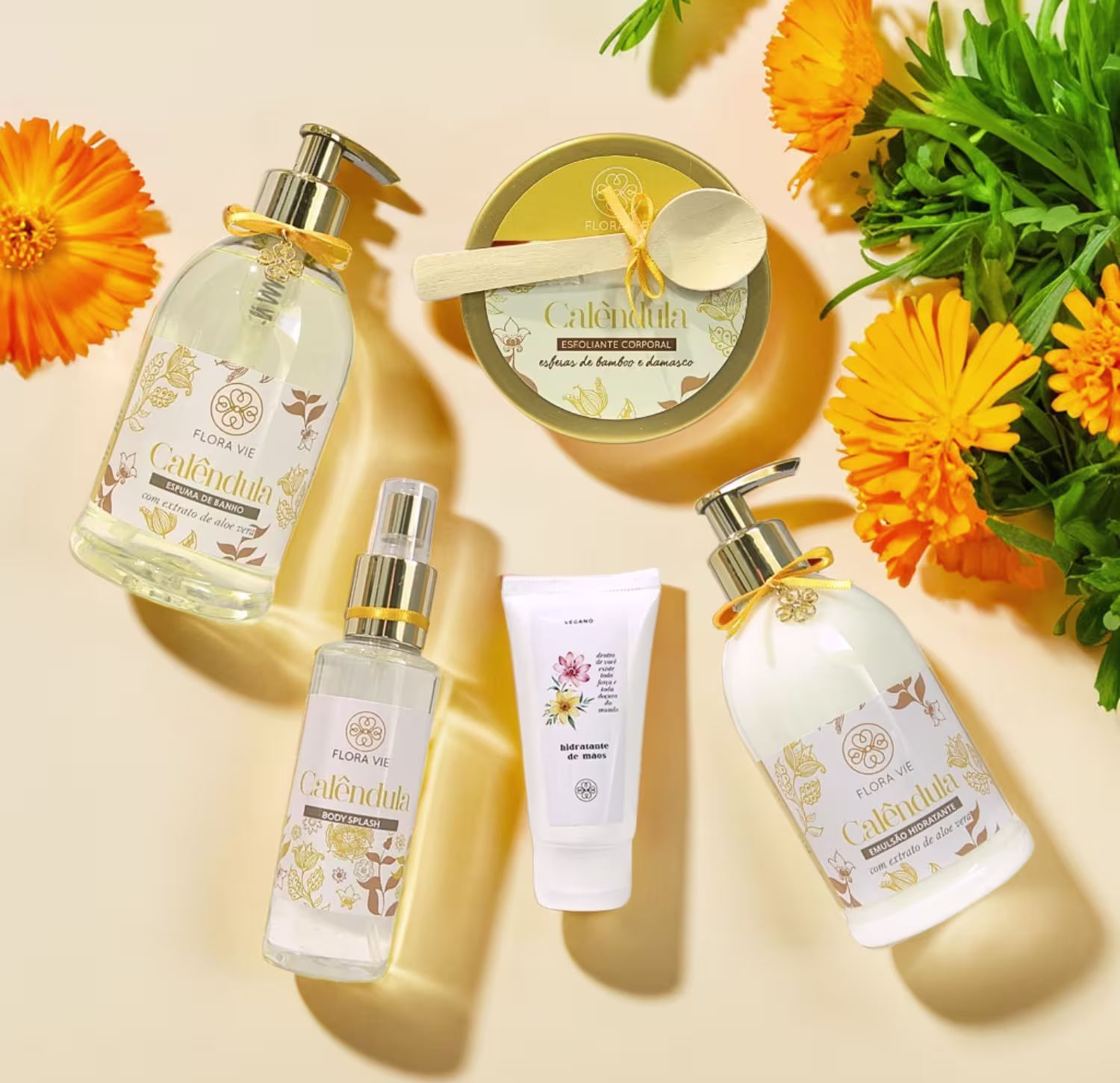 Kit Calêndula Flora Vie: Banho Cremoso, Esfoliação Suave, Hidratação Intensa, Perfumação Leve e Mãos Macias
