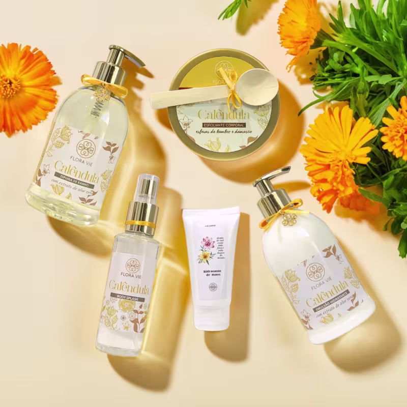 O Kit Calêndula Flora Vie foi pensado para isso: um cuidado completo que começa no banho, renova o toque da pele, mantém a hidratação e finaliza com perfumação suave — com um hidratante de mãos perfeito para acompanhar sua rotina.