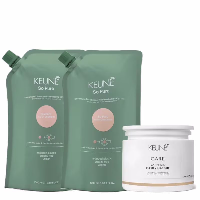Kit contendo shampoo, condicionador e máscara para cabelos secos e com frizz. Keune So Pure Polish Satin Oil limpa suavemente o cabelo, alinha e ajuda no combate do temido frizz.