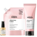 - Shampoo Profissional L'Oréal Vitamino Color (Refill 500ml): limpeza técnica suave que preserva os pigmentos da cor. Ele remove as impurezas sem agredir a fibra capilar, mantendo a integridade da coloração. Sua embalagem refill utiliza 73% menos plástico, unindo beleza e sustentabilidade;