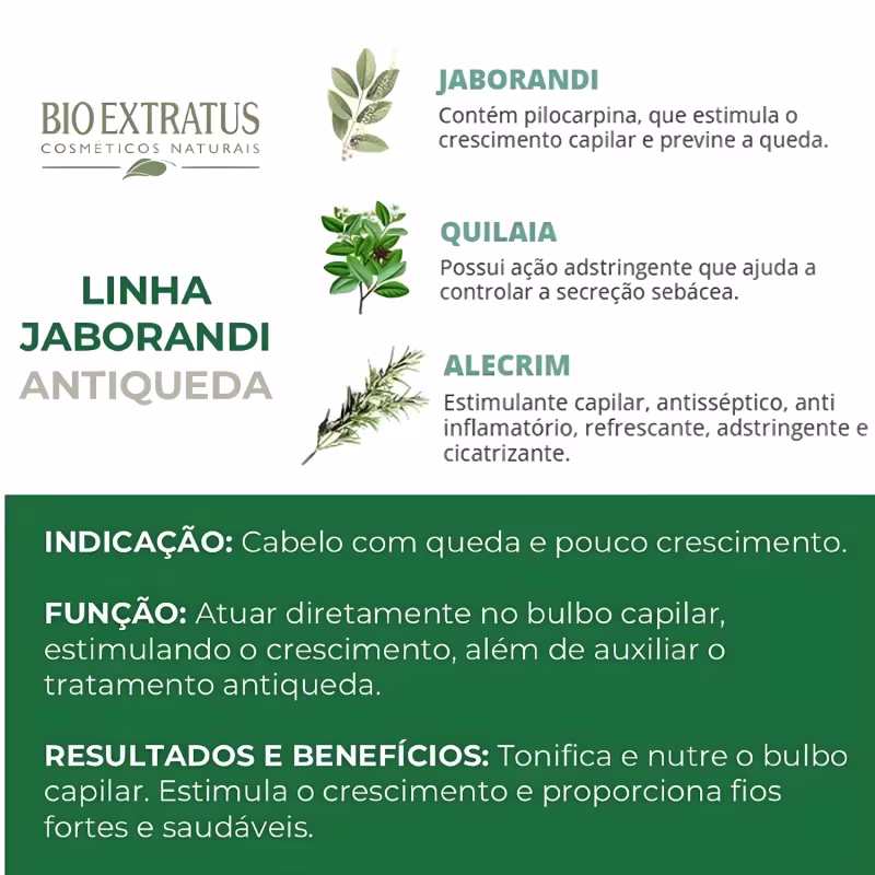 A linha Jaborandi da Bio Extratus utiliza ativos vegetais reconhecidos por sua ação estimulante no couro cabeludo, ajudando a revitalizar os fios desde a raiz.