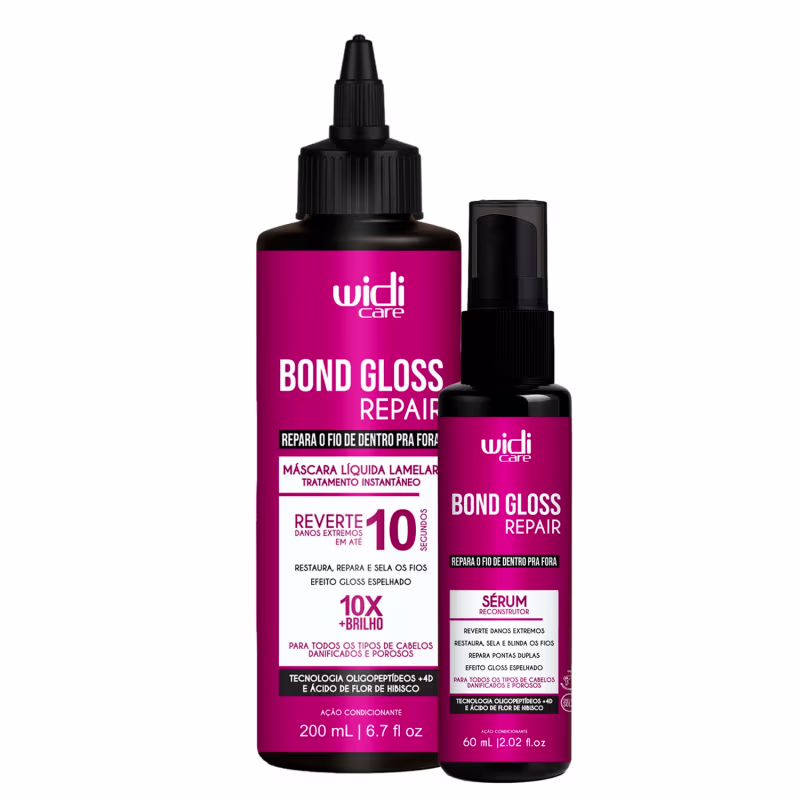 Bond Gloss Repair REPARA O FIO DE DENTRO PRA FORA Reverte danos extremos Restaura e limpa os fios Efeito gloss espelhado Nova geração de tratamento capilar! Para todos os tipos de cabelos danificados e porosos Não é apenas sobre reparar. É sobre transformar. É sobre devolver aos fios a força invisível que os sustenta: sua matriz molecular! Quando o cabelo está danificado, sua estrutura molecular, formada por um conjunto de ligações internas que garantem força, elasticidade e resistência aos fios, se quebra. O resultado? Fios frágeis, elásticos, quebradiços e sem brilho. Pensando nas necessidades reais dos cabelos danificados, Widi Care apresenta uma nova geração de tratamento inteligente, desenvolvida para restaurar profundamente a fibra capilar.  Ativos:  Oligopeptídeos + 4D é um complexo inteligente com peptídeos e 4 aminoácidos de alta afinidade capilar, que atua diretamente nas áreas danificadas do fio, penetrando no córtex para reconstruir as ligações capilares, reestruturar a fibra, proteger contra danos térmicos e químicos e devolver densidade e brilho visível aos cabelos. Ácido de Flor de Hibisco extraído das pétalas da flor é rico em ácidos orgânicos. Esses ácidos se conectam às proteínas do cabelo e ajudam a unir as camadas da fibra capilar, reduzindo a porosidade, deixando os fios mais alinhados, selados, resistentes e com brilho espelhado.   SÉRUM RECONSTRUTOR BOND GLOSS REPAIR  Reverte danos extremos Restaura, sela e blinda os fios Repara pontas duplas Efeito gloss espelhado O Sérum Reconstrutor Widi Care traz uma fórmula inovadora com Oligopeptídeos +4D e Ácido de Flor de Hibisco, que penetra até o córtex, a parte mais profunda do fio, reconstruindo ligações capilares quebradas, restaurando a estrutura interna dos cabelos e devolvendo brilho intenso e visível. Ideal para todos os tipos de cabelos danificados e porosos, o sérum prolonga o efeito do tratamento e protege os fios contra novas agressões. Modo de uso: Coloque uma pequena quantidade do sérum nas mãos e aplique nos fios secos ou úmidos, no comprimento e pontas. Uso diário. Use a linha Bond Gloss Repair para melhores resultados.   MÁSCARA LÍQUIDA LAMELAR  Reverte danos extremos em até 10 segundos  Restaura, repara e sela os fios   Efeito gloss espelhado 10x mais brilho  A Máscara Bond Gloss Repair Widi Care traz uma fórmula inovadora com Oligopeptídeos +4D e Ácido de Flor de Hibisco, que penetra até o córtex, a parte mais profunda do fio, reconstruindo ligações capilares quebradas e restaurando a estrutura interna dos cabelos. Com efeito imediato e textura fluída de rápida absorção, trata as áreas mais danificadas, devolvendo força, elasticidade, densidade e brilho visível desde a primeira aplicação. MODO DE USO: Após lavar os cabelos com o shampoo Bond Gloss Repair WIdi Care, aplique uma pequena quantidade da Máscara Líquida nos cabelos molhados. Enluve e massageie todo o comprimento dos fios por 10 segundos. Ao massagear, você irá perceber um creme se formando e um leve aquecimento do produto. Enxágue. Se você sentir necessidade, utilize o Leave-in 2 em 1 Bond Gloss Repair, para condicionador e/ou finalizar os fios. Uso diário.  Use a linha Bond Gloss Repair para melhores resultados.