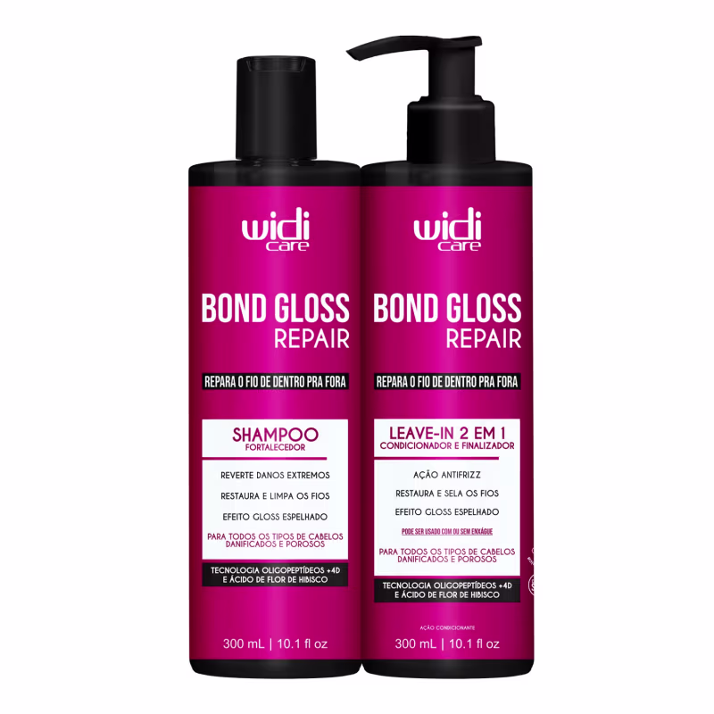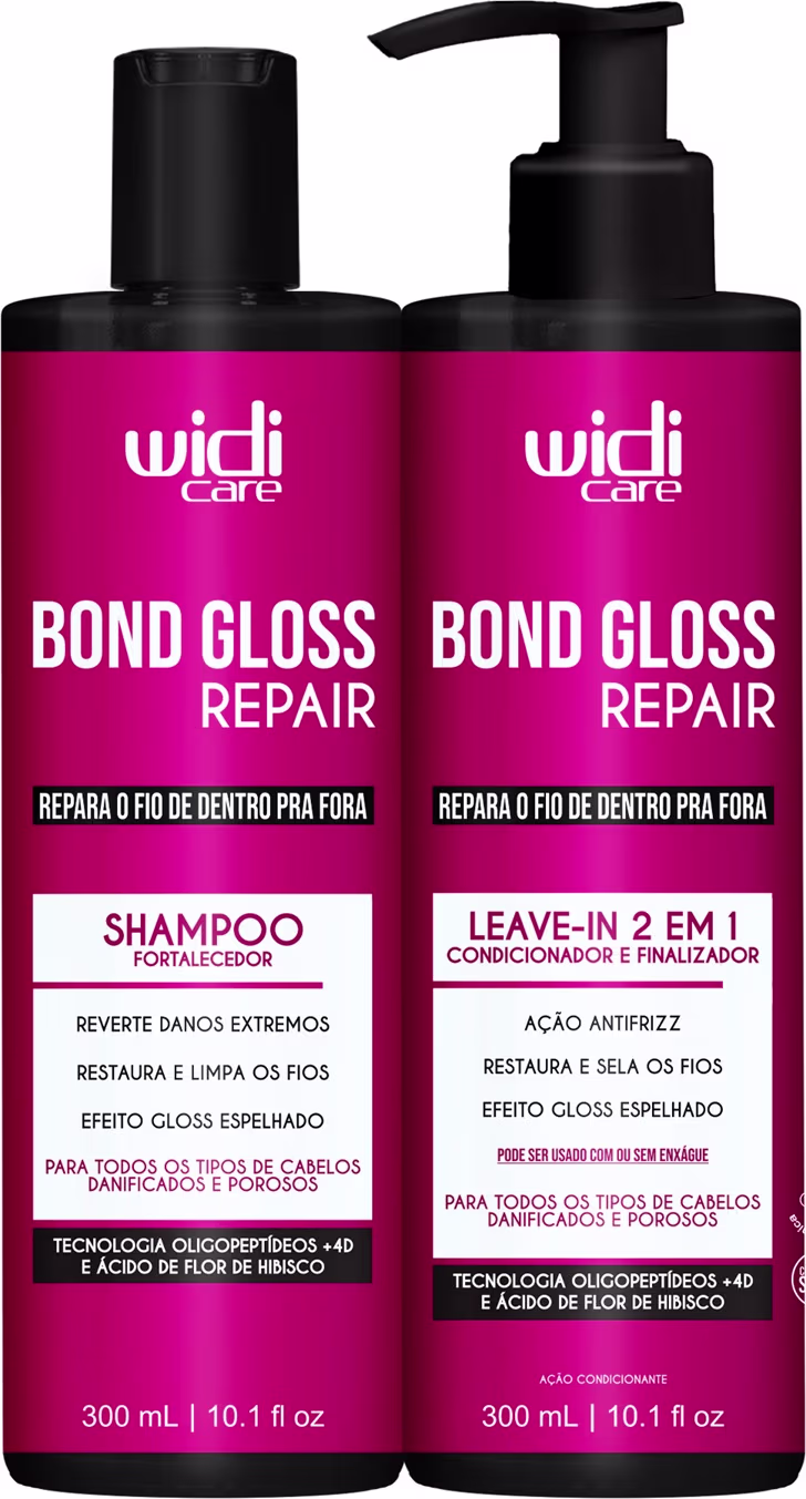 Bond Gloss Repair REPARA O FIO DE DENTRO PRA FORA Reverte danos extremos Restaura e limpa os fios Efeito gloss espelhado Nova geração de tratamento capilar! Para todos os tipos de cabelos danificados e porosos Não é apenas sobre reparar. É sobre transformar. É sobre devolver aos fios a força invisível que os sustenta: sua matriz molecular! Quando o cabelo está danificado, sua estrutura molecular, formada por um conjunto de ligações internas que garantem força, elasticidade e resistência aos fios, se quebra. O resultado? Fios frágeis, elásticos, quebradiços e sem brilho. Pensando nas necessidades reais dos cabelos danificados, Widi Care apresenta uma nova geração de tratamento inteligente, desenvolvida para restaurar profundamente a fibra capilar.  Ativos:  Oligopeptídeos + 4D é um complexo inteligente com peptídeos e 4 aminoácidos de alta afinidade capilar, que atua diretamente nas áreas danificadas do fio, penetrando no córtex para reconstruir as ligações capilares, reestruturar a fibra, proteger contra danos térmicos e químicos e devolver densidade e brilho visível aos cabelos. Ácido de Flor de Hibisco extraído das pétalas da flor é rico em ácidos orgânicos. Esses ácidos se conectam às proteínas do cabelo e ajudam a unir as camadas da fibra capilar, reduzindo a porosidade, deixando os fios mais alinhados, selados, resistentes e com brilho espelhado.   SHAMPOO BOND GLOSS REPAIR Widi Care traz uma fórmula inovadora com Oligopeptídeos +4D e Ácido de Flor de Hibisco, que limpa suavemente e fortalece a estrutura molecular da fibra capilar, revertendo danos extremos no córtex, a parte mais profunda do fio, deixando os fios reparados e saudáveis. Ideal para todos os tipos de cabelos danificados e porosos, este é o primeiro passo da sua rotina de cuidado capilar para uma transformação inteligente dos fios. MODO DE USO: Aplique sobre os cabelos molhados, massageando o couro cabeludo para obter uma espuma cremosa. Deixe agir enquanto espalha a espuma por todo o comprimento do cabelo. Se necessário, repita a aplicação. Enxágue bem, e a seguir aplique a Máscara Líquida Widi Care Bond Gloss Repair. Uso diário. Use a linha Bond Gloss Repair para melhores resultados.   BOND GLOSS REPAIR LEAVE-IN 2 EM 1: CONDICIONADOR E FINALIZADOR  Ação antifrizz  Restaura e Sela os Fios  Efeito Gloss espelhado   O Leave-in 2 em 1 Widi Care traz uma fórmula multifuncional que pode ser usada como condicionador e também como leave-in. Desenvolvido com a tecnologia Oligopeptídeos  +4D e Ácido de Flor de Hibisco, penetra até o córtex, a parte mais profunda do fio, reconstruindo ligações capilares quebradas e restaurando a estrutura interna dos cabelos. Ideal para cabelos danificados e porosos, este multifuncional pode ser usado como condicionador, para desembaraçar e selar, ou como leave-in, protegendo os fios dos danos causados por coloração, químicas e calor, além de mantê-los protegidos contra danos futuros.  Modo de uso como Condicionador: Após higienizar os fios com o Shampoo Bond Gloss Repair Widi Care, aplique por todo o comprimento e pontas. Deixe agir por 3 minutos e enxágue retirando todo o produto. Uso diário. Modo de uso como Leave In: Após a higienização, aplique nos cabelos úmidos ou secos, do comprimento às pontas. Em seguida, finalize com ou sem o uso de calor. Uso diário.  Use a linha Bond Gloss Repair para melhores resultados.