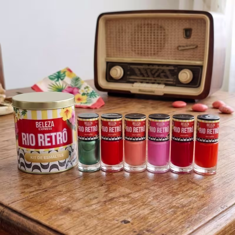 Kit presente Rio Retrô 6 esmaltes, lata e radio bluetooth