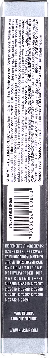 Klasme Eyeliner Pencil possui textura macia, que desliza facilmente e de forma confortável. Depois que seca, fixa muito bem sobre a pele. Ainda vem com uma esponja para esfumar o traço e um apontador, ambos acoplados à tampa, para que seu lápis esteja sempre pronto para o uso.