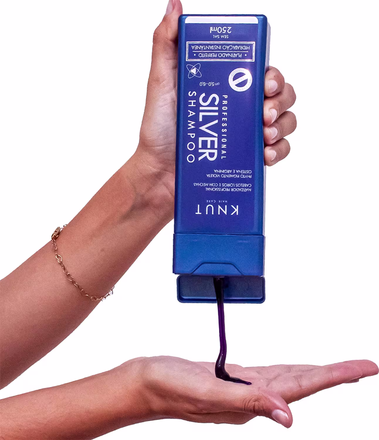 Knut Silver Shampoo conta com pigmentos violeta que deixam um efeito platinado e reduzem as chances de chumbar o cabelo, ou seja, escurecer o tom e acinzentar. Além disso, proporciona uma hidratação instantânea para que, logo na primeira aplicação, seu cabelo fique livre do amarelo e com aparência saudável ao mesmo tempo.