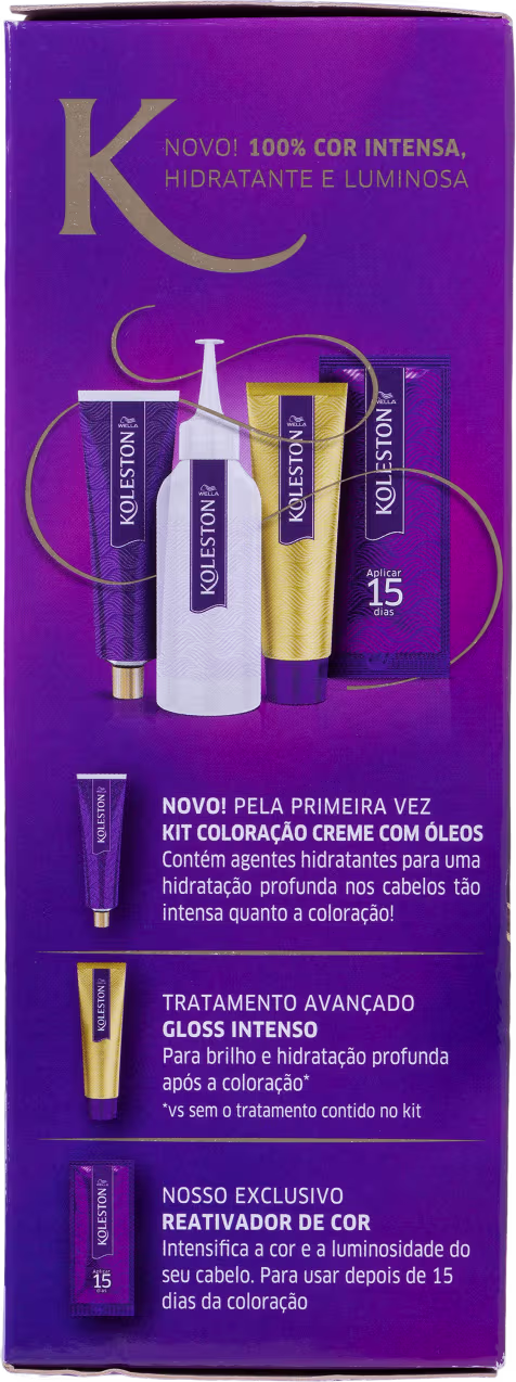 Coloração Koleston Permanente apresenta uma variedade de cores intensas e luminosas, que hidratam completamente enquanto colorem os fios. A fórmula garante longa duração e foi desenvolvida para realçar os 7 sinais de um cabelo saudável: luminosidade, maciez, sedosidade, força, hidratação, tom vibrante e de fácil penteabilidade. O kit contém um tratamento gloss intenso que hidrata e protege a cor; um reativador de cor para ser usado 15 dias após a coloração; dois pares de luvas e um folheto de instrução.