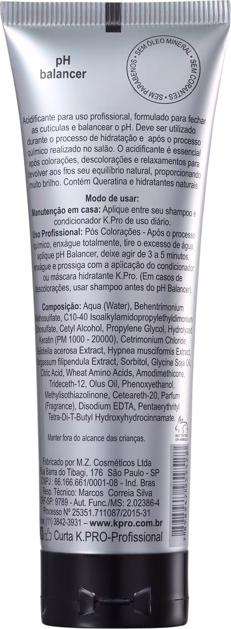 Tratamento para cabelos pós-química. Exclusivo para uso profissional, sela cutículas e equilibra o pH. K.Pro pH Balancer Acidificante devolve a saúde e vitalidade dos cabelos, além de eliminar resíduos de outras químicas.