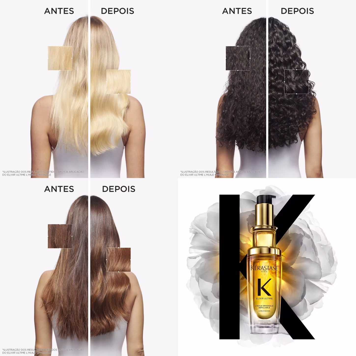 Kit Kérastase Elixir Ultime L'Huile Originale Refil Duo um mergulho de nutrição e brilho para os fios. Melhores Kits de Kérastase na BLZ. Ver mais ❯