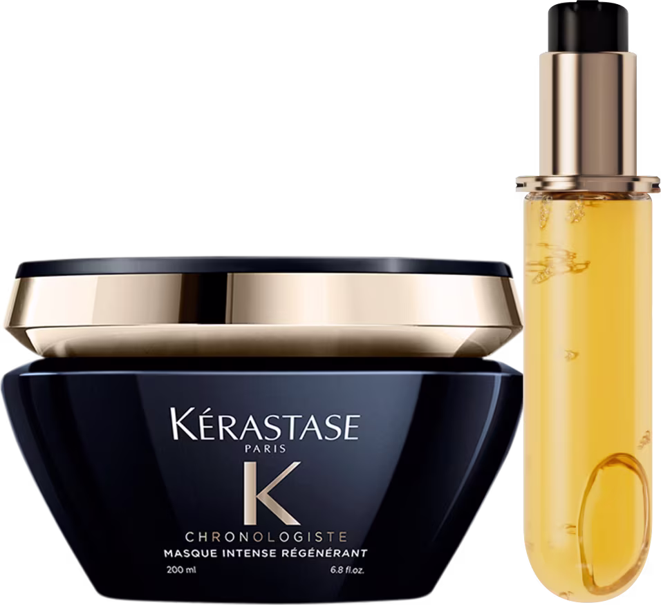 Kit com máscara e óleo refil para todos os tipos de cabelo que necessitam de revitalização. Kérastase Chronologiste Masque Elixir Ultime L'Huile Originale Refil revitaliza completamente o cabelo e o couro cabeludo com uma experiência de luxo.