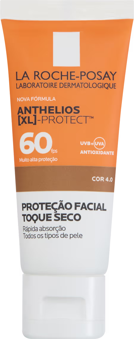 Protetor solar com cor para todos os tipos de pele. Com toque seco, Anthelios XL Protect FPS 60 uniformiza o tom e protege do envelhecimento precoce causado pela exposição solar.