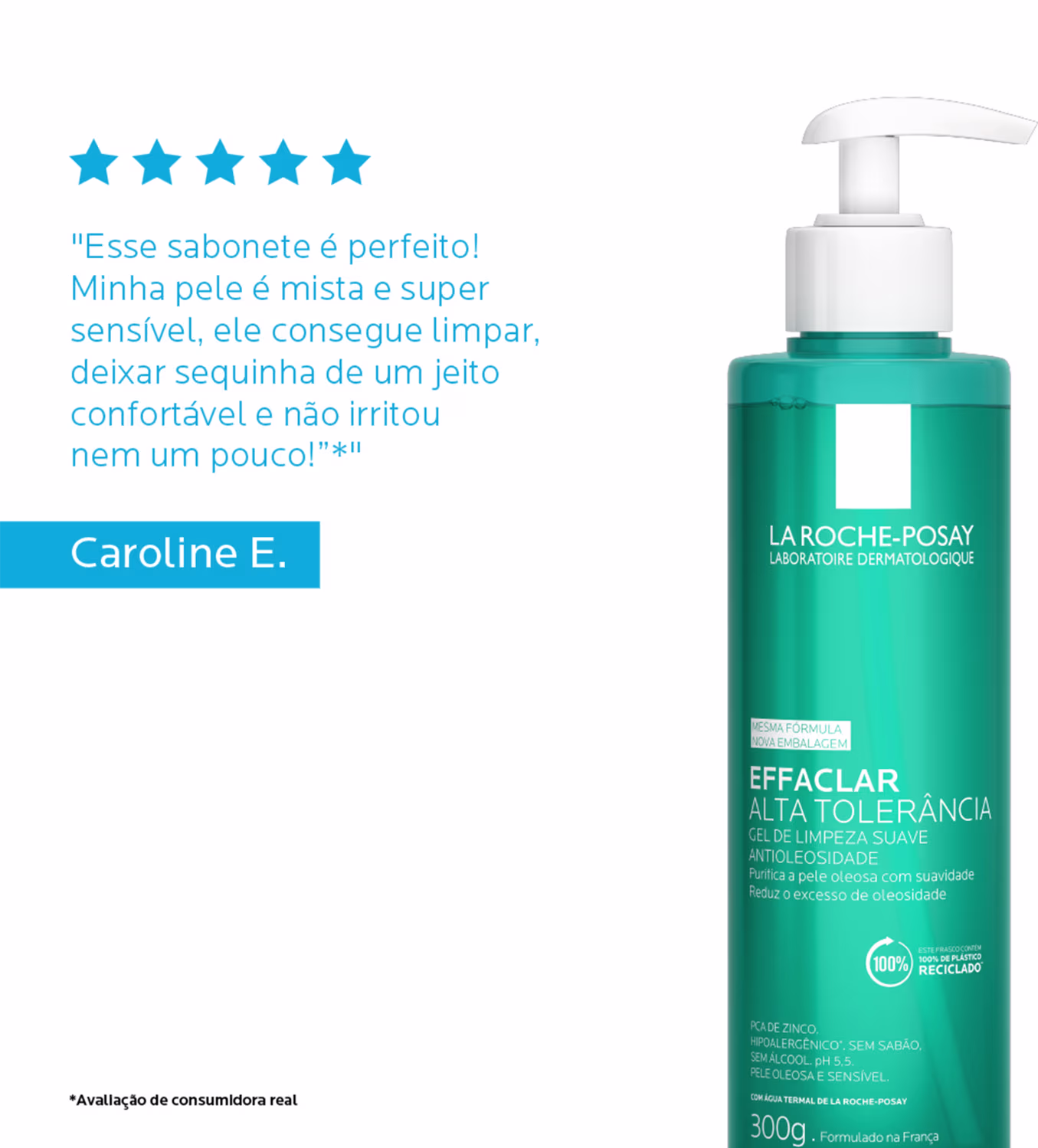 Gel de limpeza para peles mistas e oleosas. La Roche-Posay Effaclar Alta Tolerância controla a produção de sebo excessiva e limpa com suavidade.