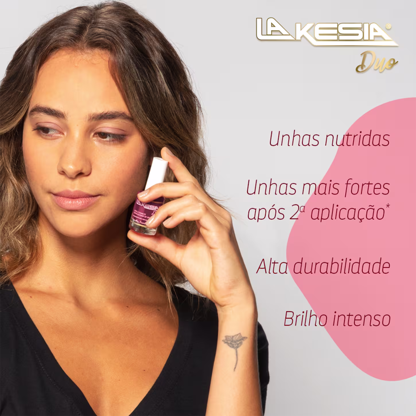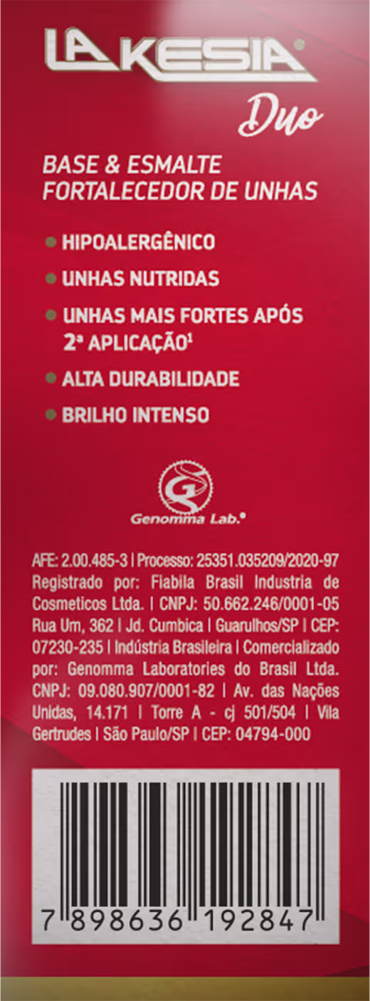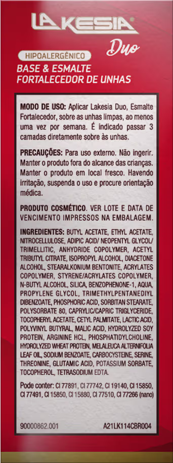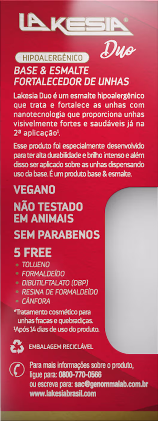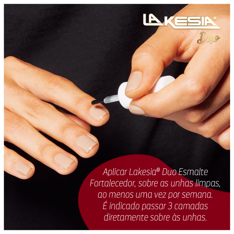 A Base e Esmalte Lakesia Duo Fortalecedor Preto Groselha Negra possui uma fórmula potente que associa vitamina E, Óleos Essenciais e Nanotecnologia, que juntos atuam na: reparação dos danos das unhas, hidratação e nutrição, fortalecimento e estímulo do crescimento saudável delas, obtendo resultados visíveis já na segunda aplicação.